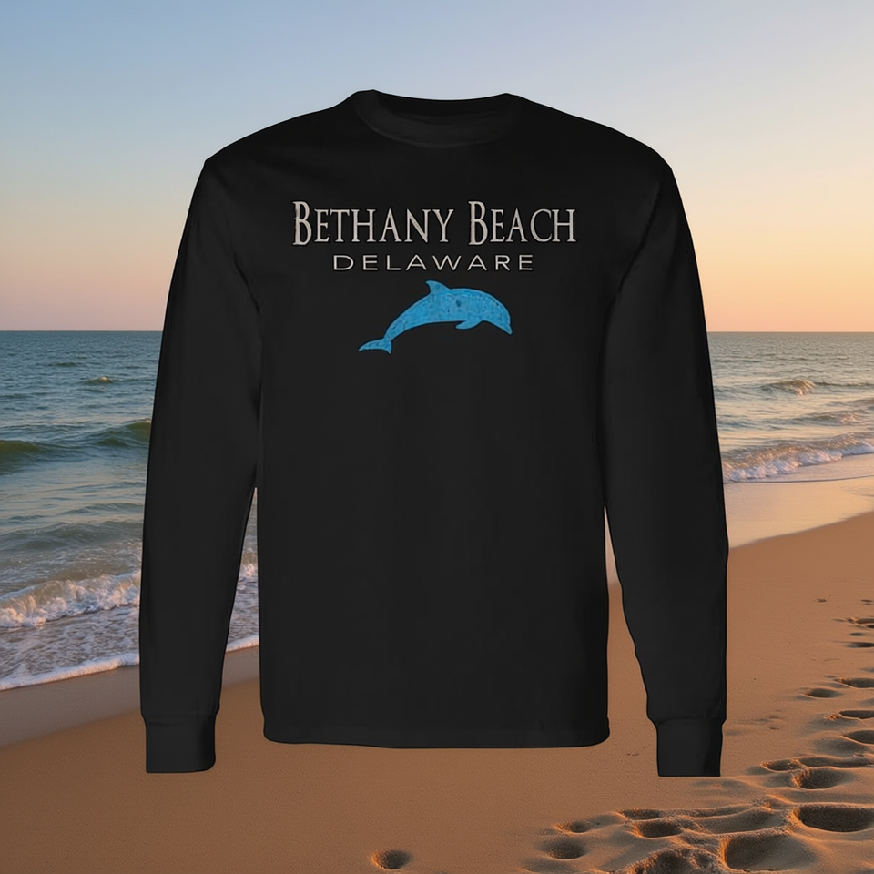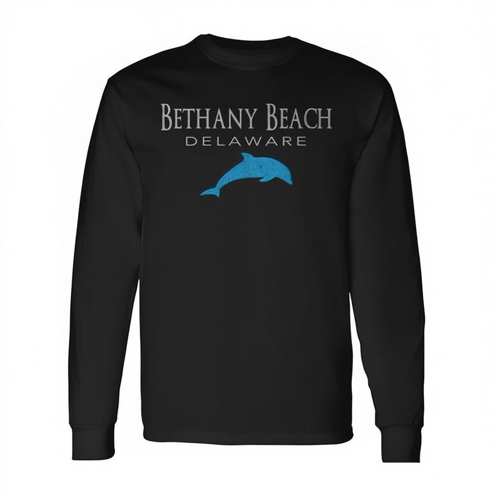 T-shirt a maniche lunghe Bethany Beach Delaware Dolphin, girocollo unisex, promozionale per adulti