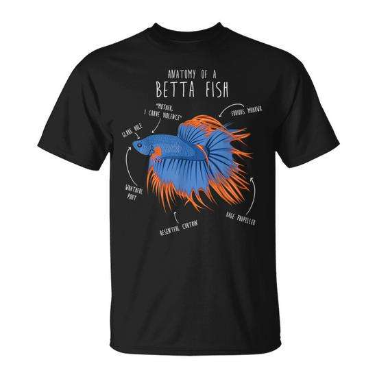 T-shirt con anatomia del pesce Betta per gli amanti degli acquari, design blu e arancione