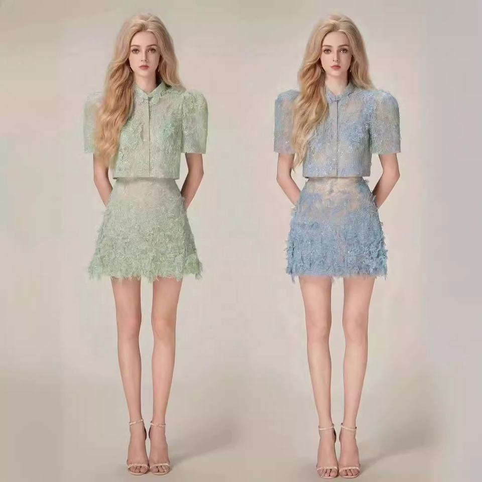 Bettergirl Summer Vietnamese Designer New Temperament Fashion Three-dimensional Lace Bubble Sleeve Short Sleeve Skirt Suit