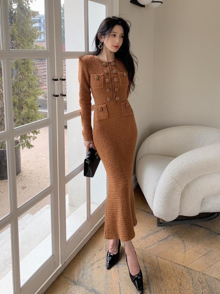 Bettergirl Winter Women's Long-sleeved Round Neck Waffle Knit Maillard Dress With Wool Base Long Dress