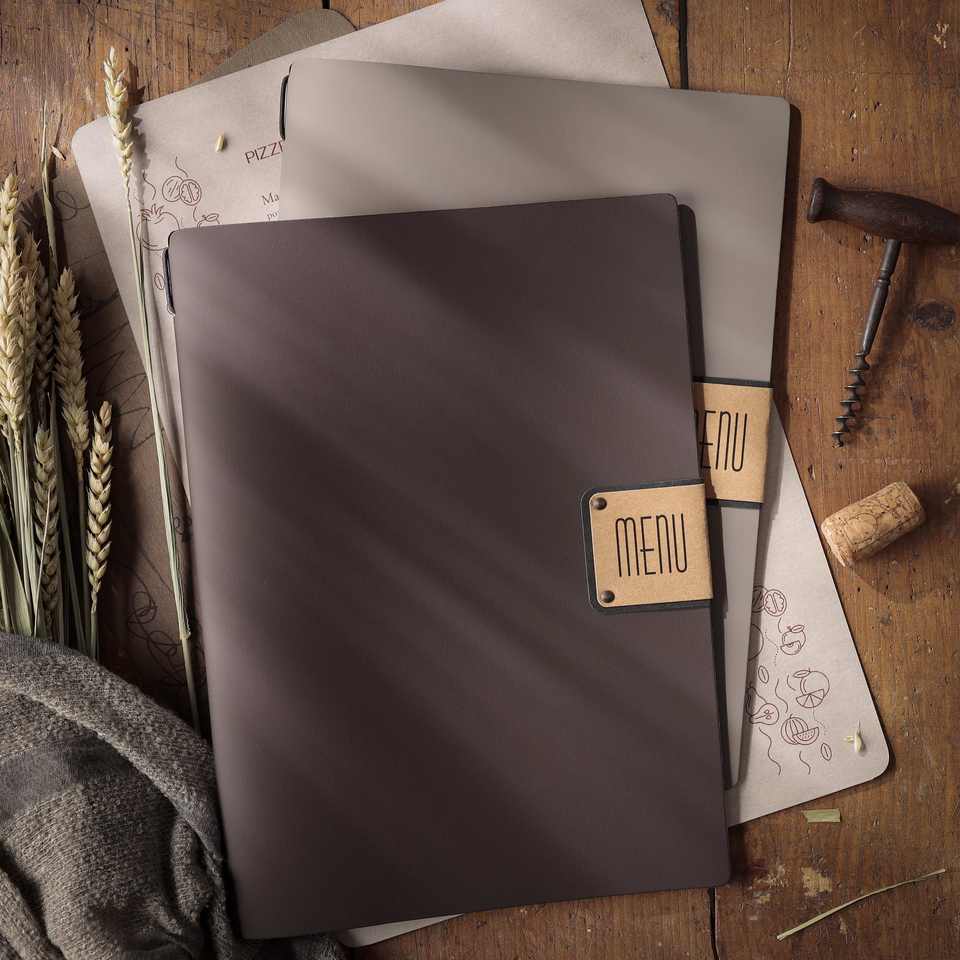Porta Menu A4 (23,2x31,8 cm) etichetta PATCH "menu" 2 tasche (4 lati) elastico nero BICOLOR SABBIA