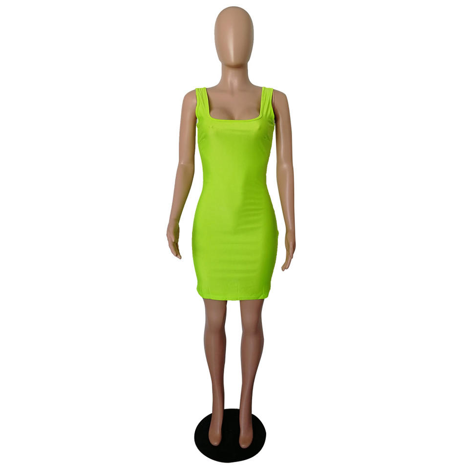 Big Discount on Sales Women Dresses Summer Clothes Women Solid Color Bodycon Dress Women Neon Green Midi Dress