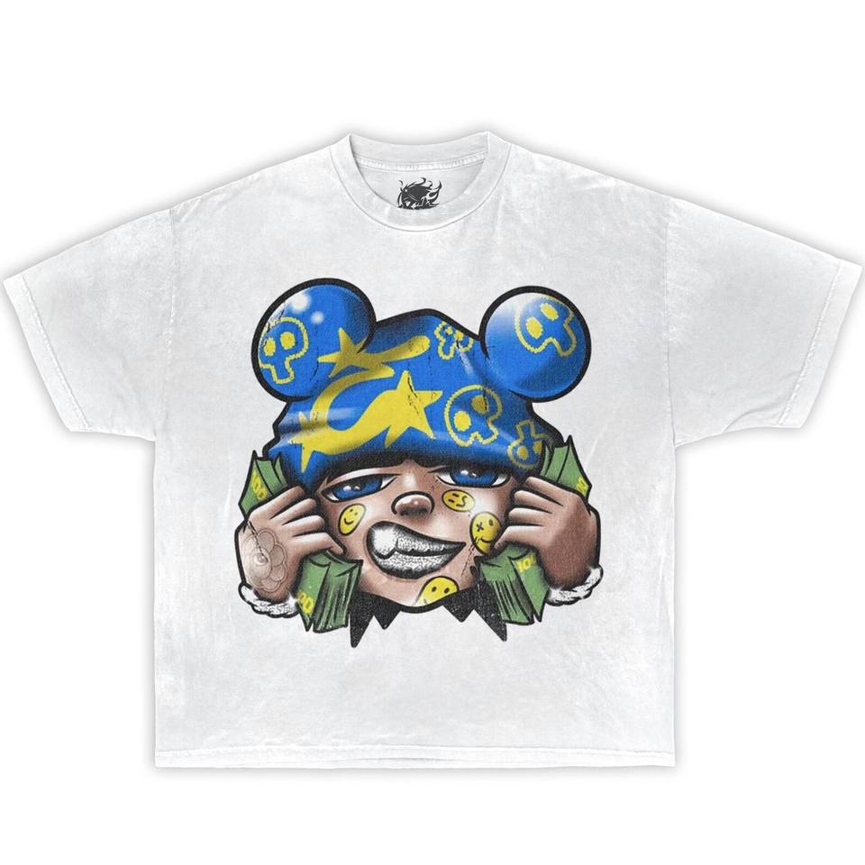 T-Shirt Oversize con Grafica 'Big Money Talker', Stile Streetwear Y2K, Stampa Cartoon, Logo Frontale Bianco, Manica Corta, 100% Cotone