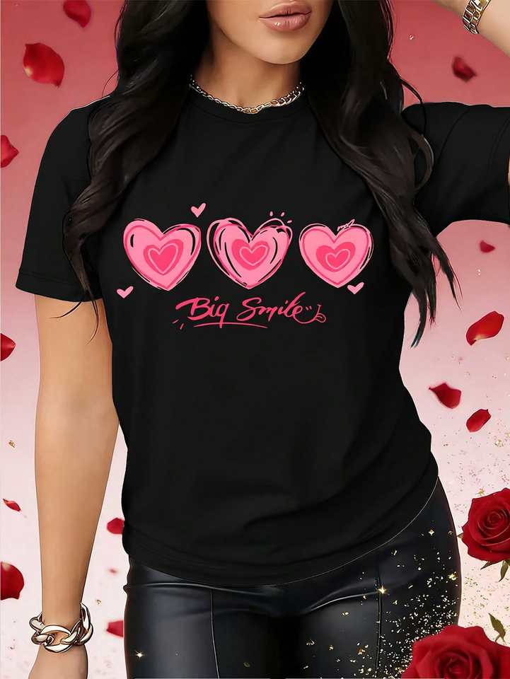 Big Smile Women's Valentine Heart Print T-Shirt Round Neck Short Sleeve Casual Top Breathable Lightweight Cotton Spring Summer