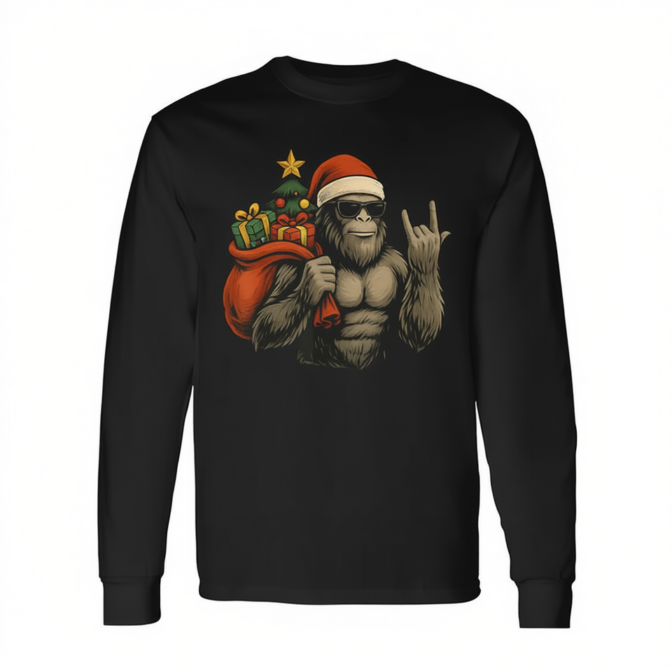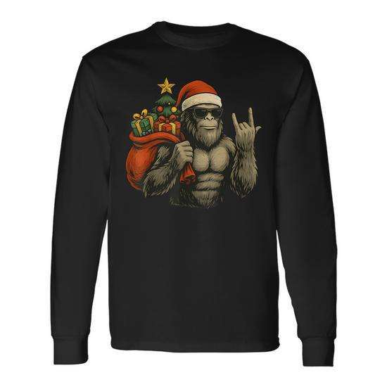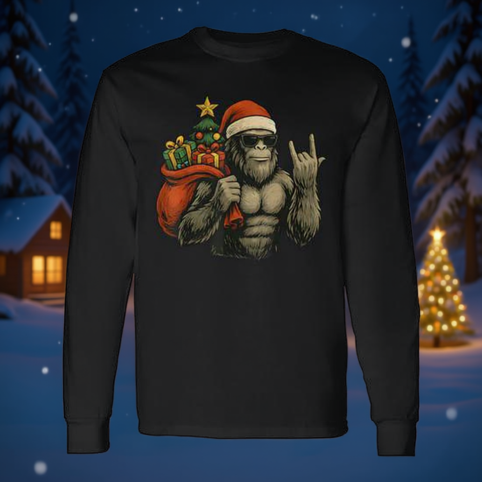 Maglietta a maniche lunghe Bigfoot Santa Christmas Tree Rock On Xmas Sasquatch