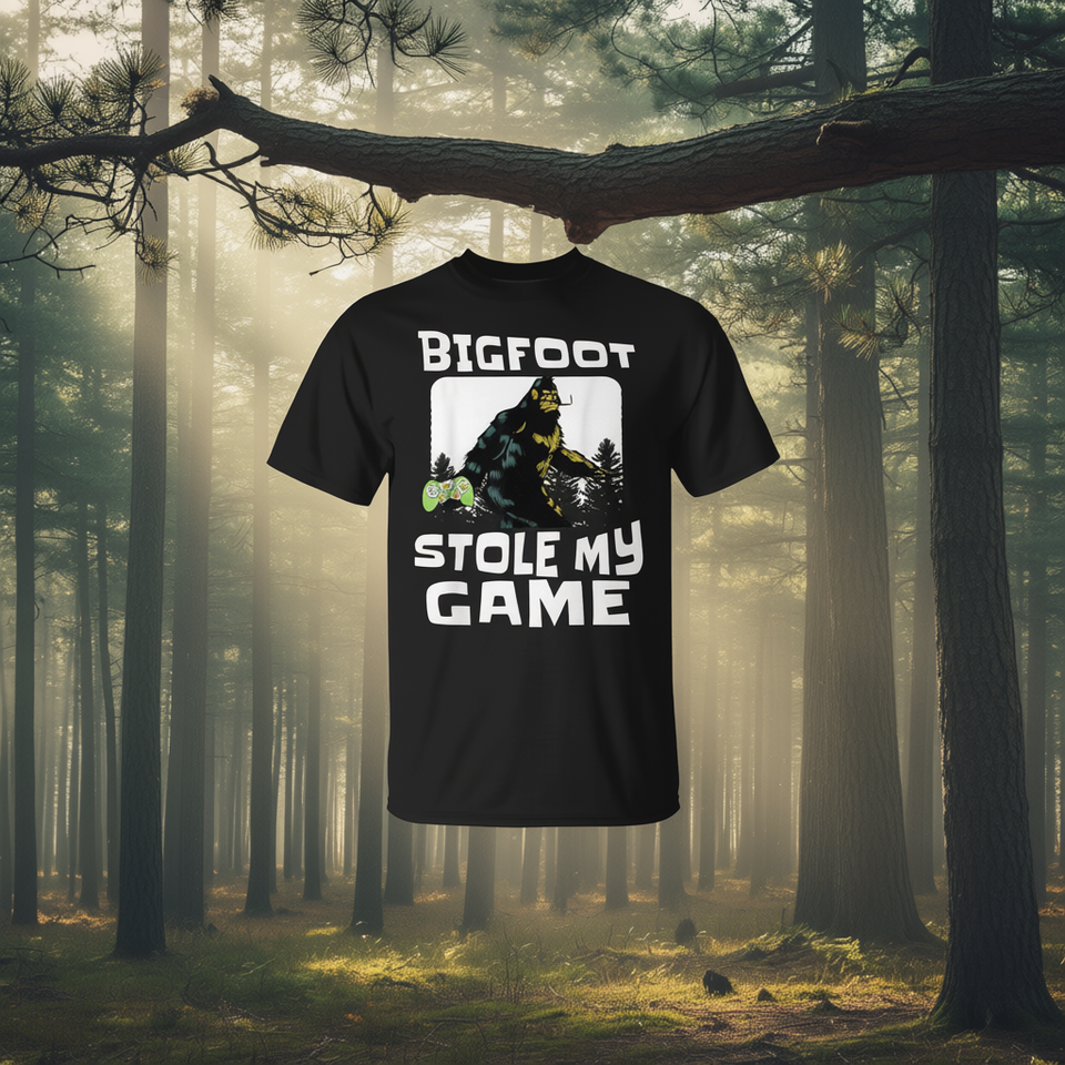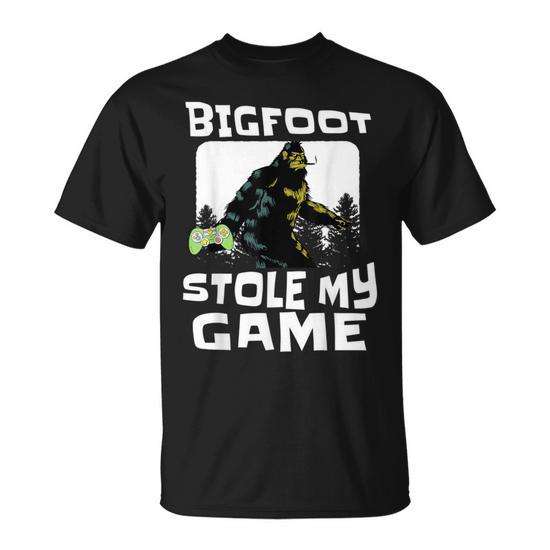 Bigfoot Stole My Game Gamer Tee Maglietta per giocatori di videogiochi in prima persona