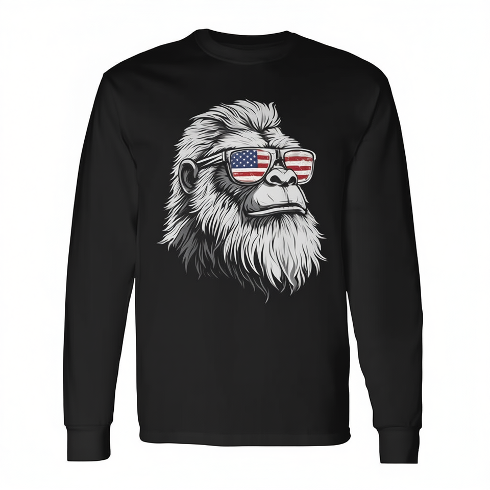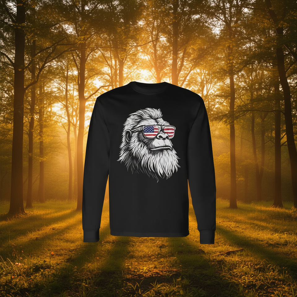 Maglietta a maniche lunghe Bigfoot con occhiali da sole e bandiera degli Stati Uniti