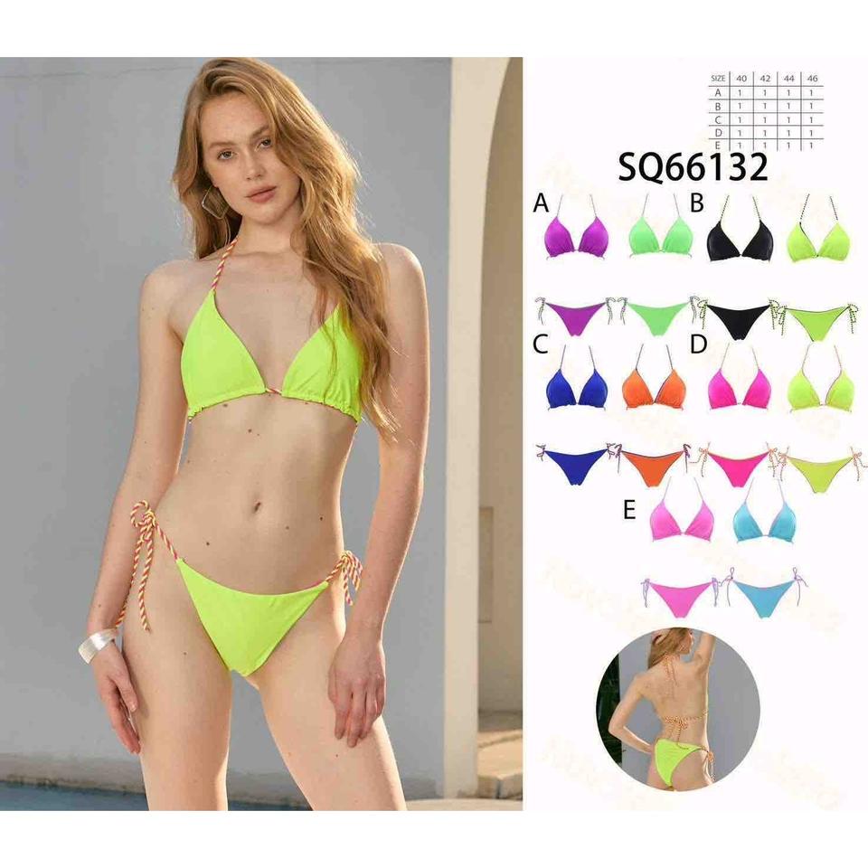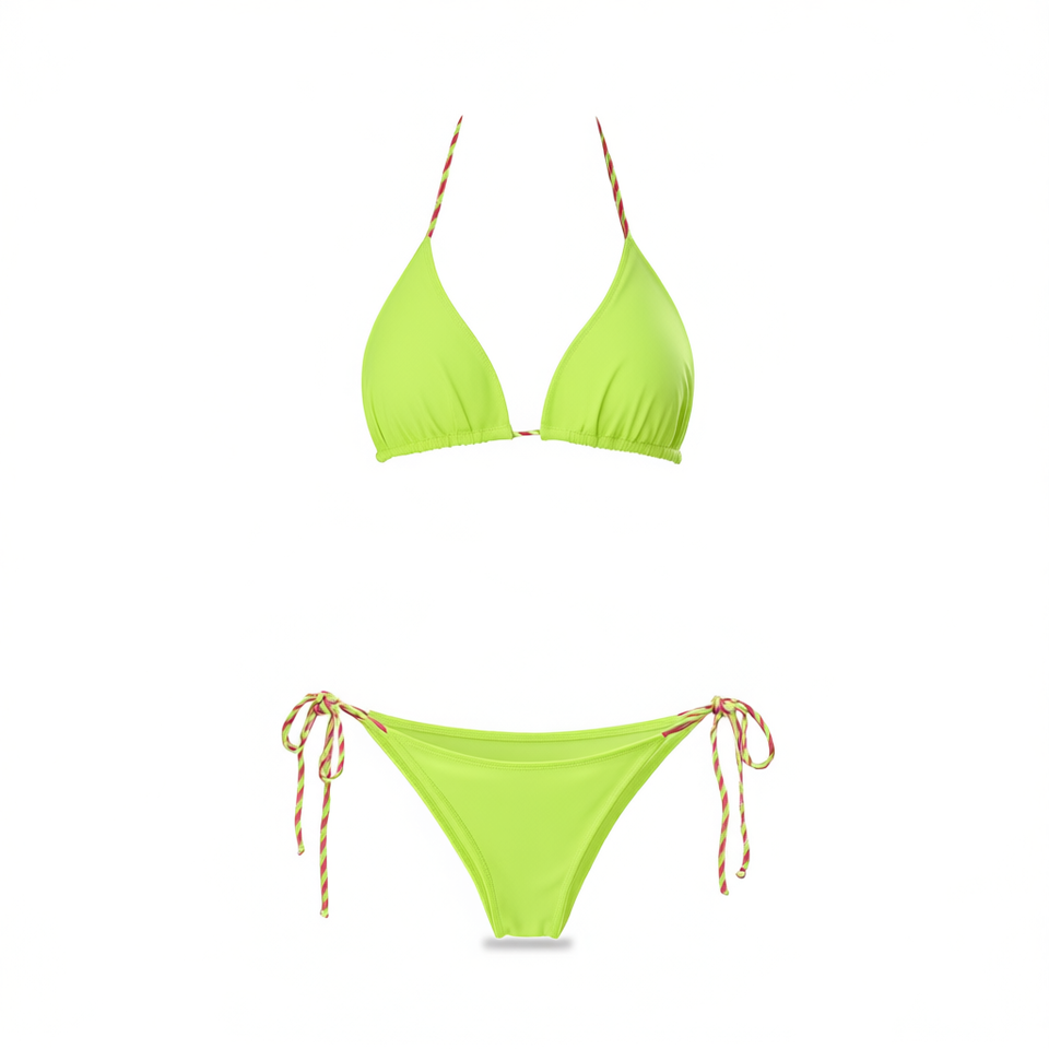 Costume da bagno bikini HDJ verde neon con laccetti laterali e allacciatura al collo, elasticizzato, tinta unita, taglie 40 42 44 46