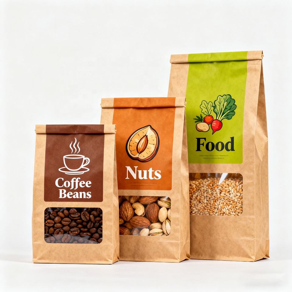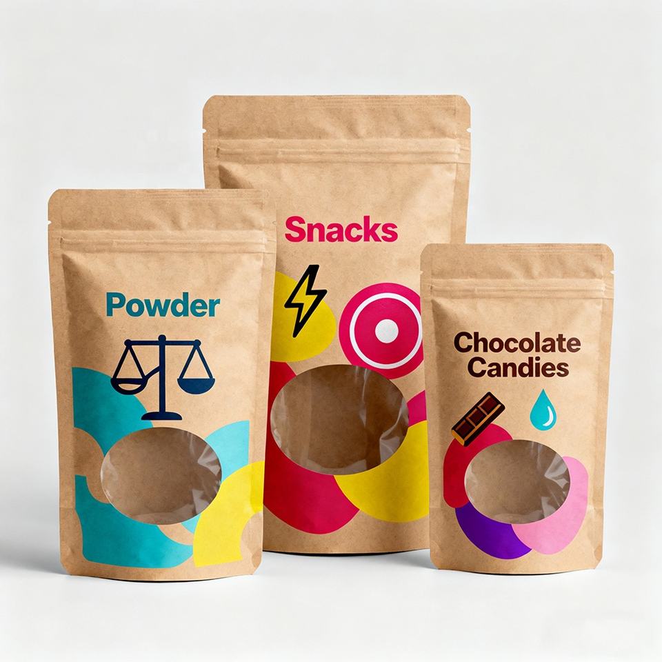 Biodegradabile richiudibile con cerniera cibo biscotto in plastica marrone chiusura lampo in plastica Kraft Stand up sacchetto di imballaggio con finestra
