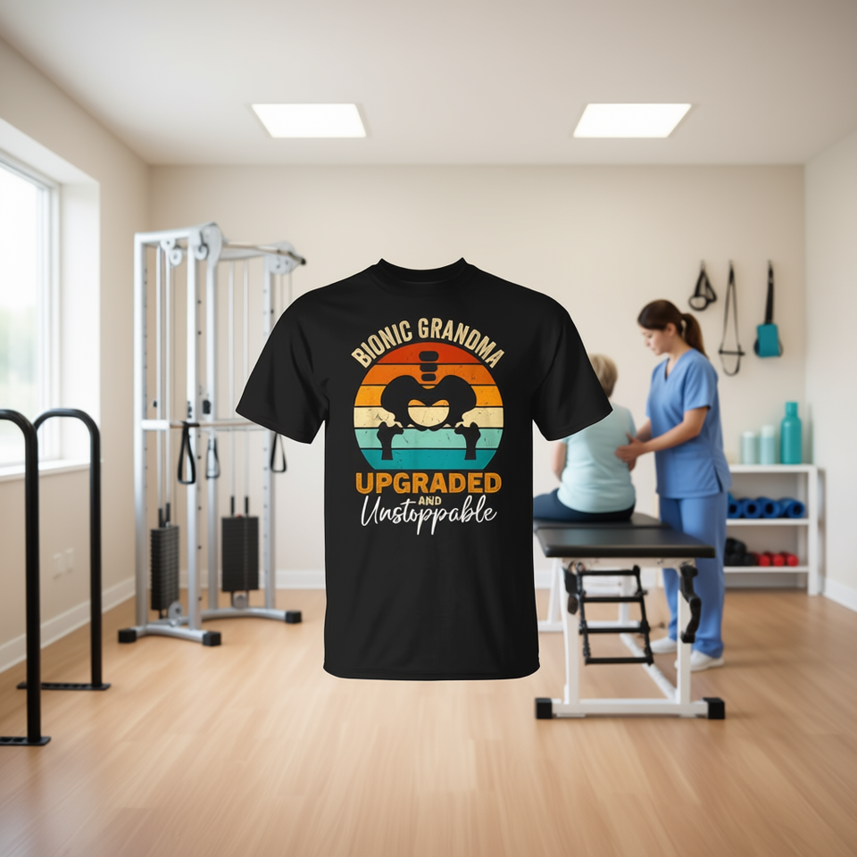 T-shirt Bionic Grandma per il recupero post-intervento alla protesi dell'anca, ideale per il centro di riabilitazione