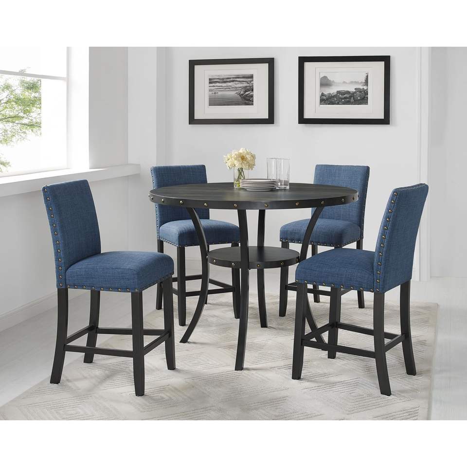 Espresso Wood Counter Height Dining Set with Blue Fabric Nailhead Stools for Your Modern Dining Room