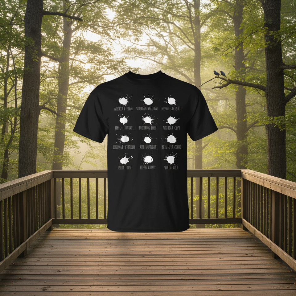 T-shirt per birdwatcher con grafico delle feci di uccelli, nera, per adulti, unisex, girocollo, manica corta, stampa serigrafica