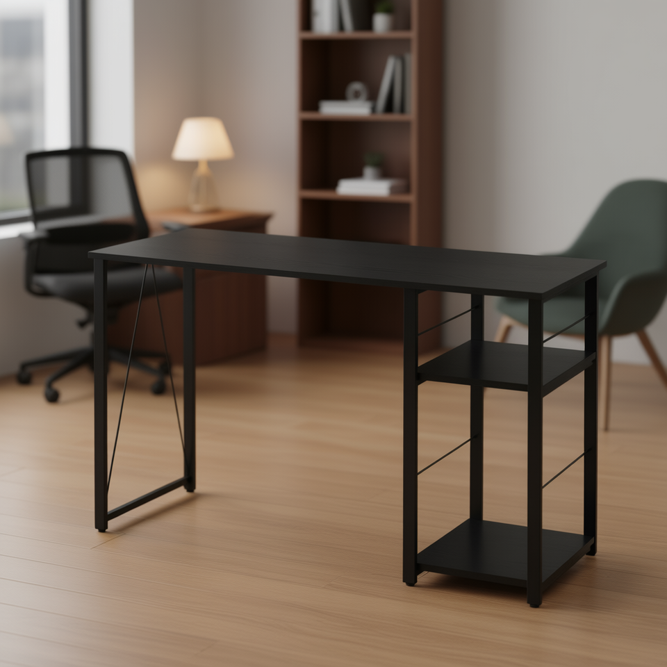 Scrivania da Ufficio Rettangolare Nera a 2 Ripiani con Piano in Metallo e Legno, Design Moderno e Minimalista, Scrivania Autoportante