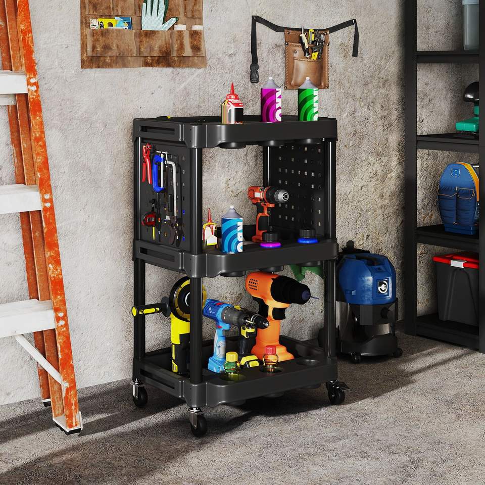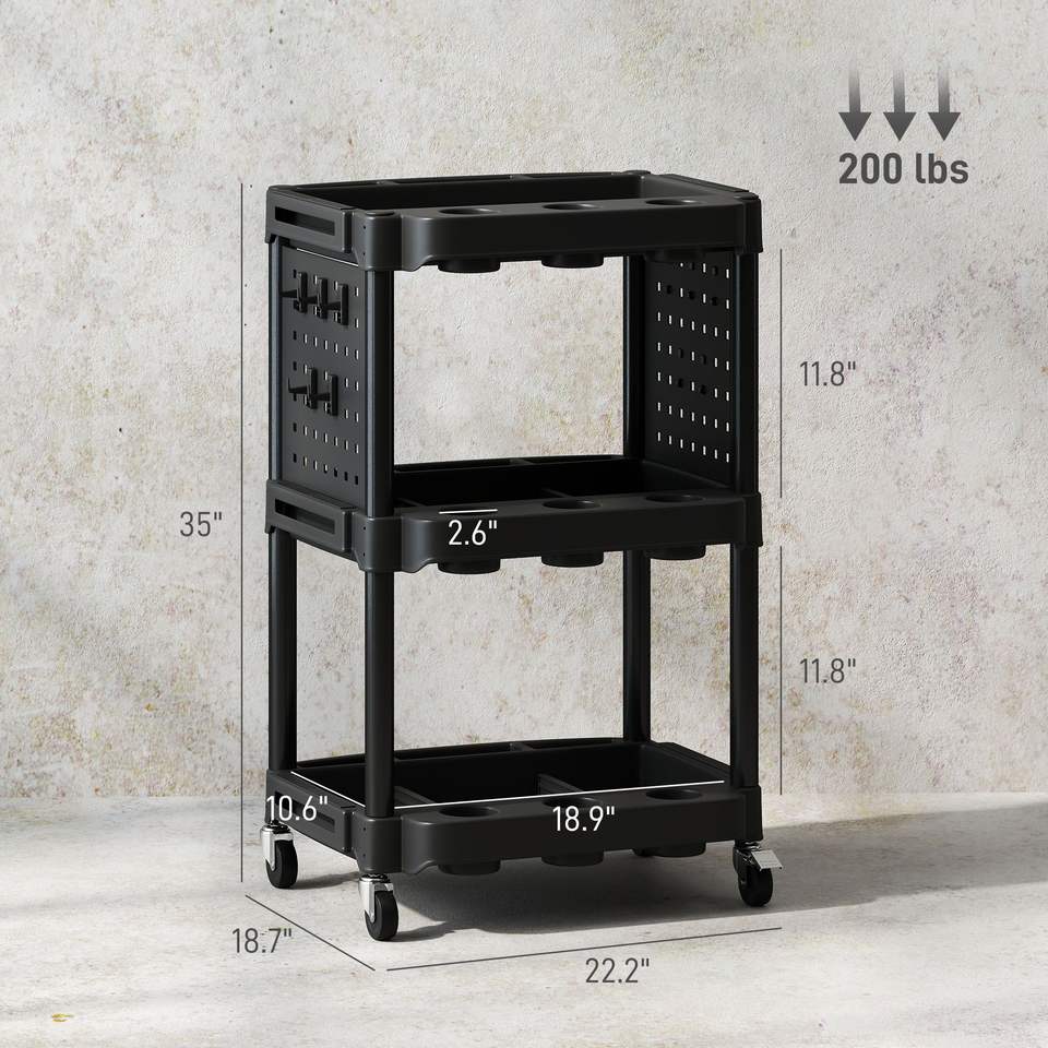 Carrello Portautensili Nero a 3 Ripiani, Capacità 200 LBS, Carrello Multiuso in Plastica con Ripiani Laterali per Garage e Officina