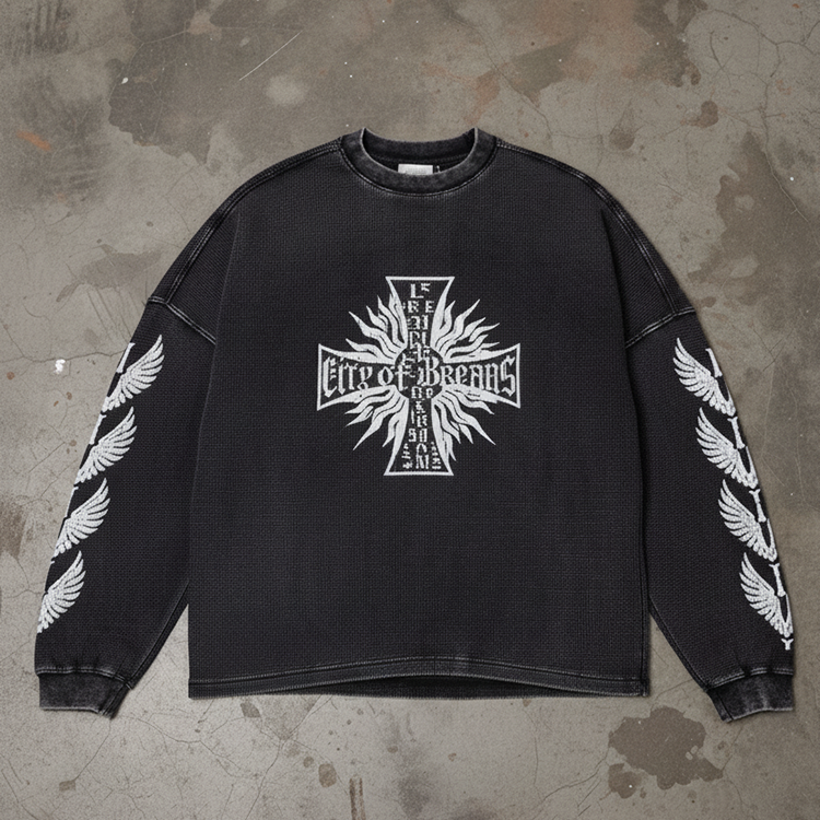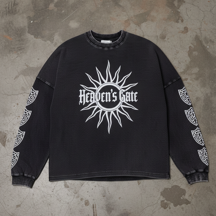 Black Acid Washed Cotton Waffle Fabric Customize Screen Print Patterns Cuff Ribbed Design Waffle Long Sleeve Thermal Knit Shirts