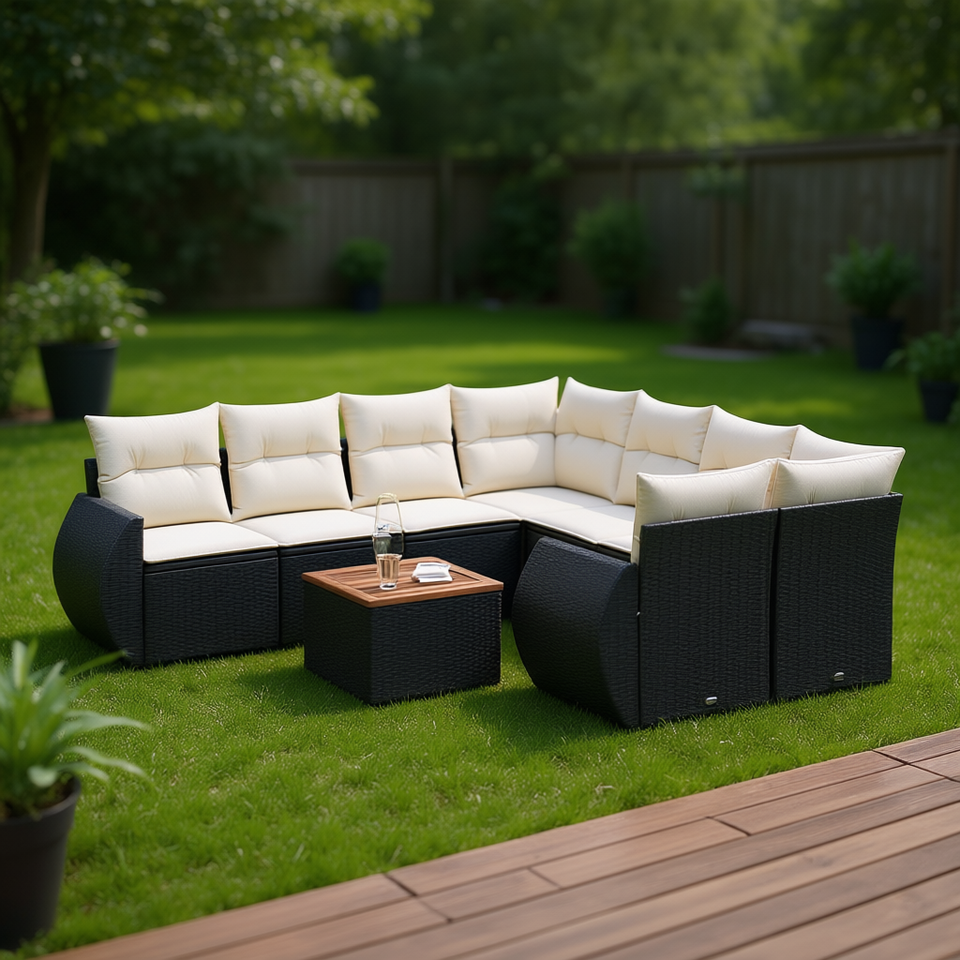 Set Divano da Giardino Nero e Crema con Cuscini, Arredamento da Esterno in Rattan, Design Contemporaneo Impermeabile