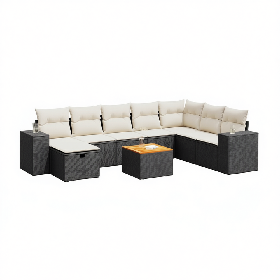 Set Divano da Giardino Nero e Crema con Contenitore, Mobili da Esterno in Rattan PE Intrecciato, Cuscini Impermeabili, Design Contemporaneo