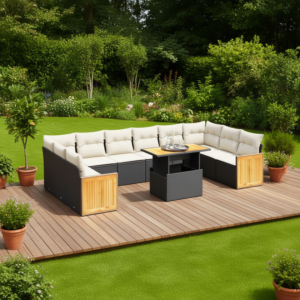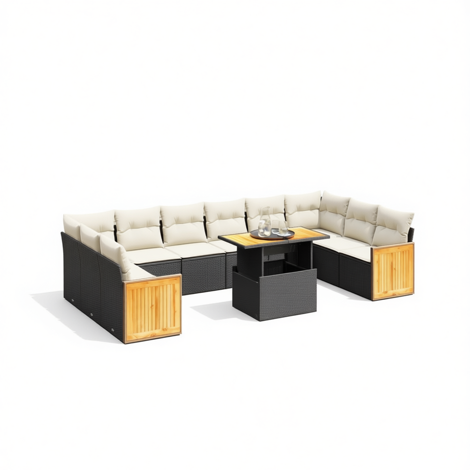 Set Divano da Giardino in Rattan Nero e Crema 6 Posti Resistente alle Intemperie Arredamento da Esterno Design Contemporaneo in Legno di Teak