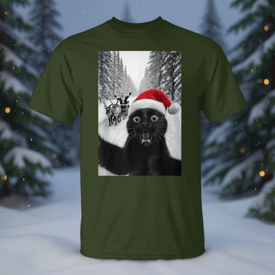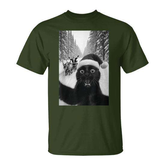 T-shirt natalizia con selfie di gatto nero con Babbo Natale, unisex, taglia media per adulti