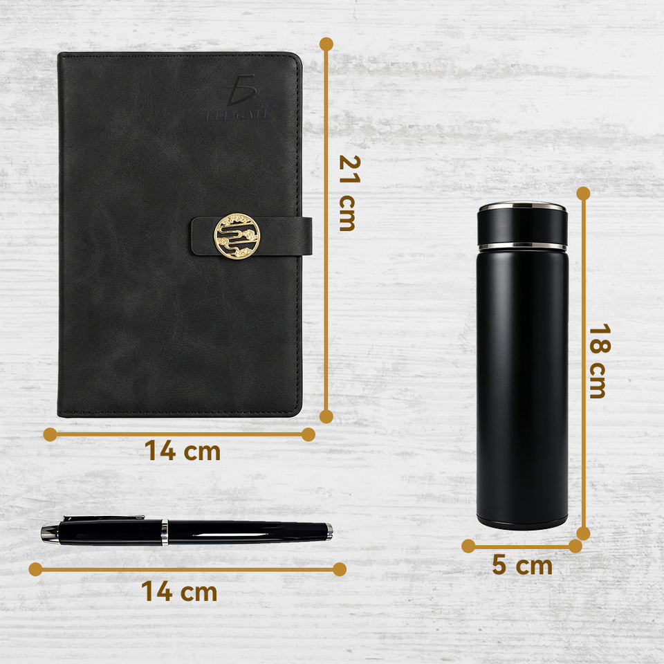 Set Regalo Aziendale in Smalto Nero con Taccuino, Thermos in Acciaio Inox, Penna con Finitura Simil-Pelle e Chiusura Magnetica