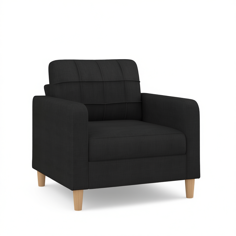 Poltrona in Tessuto Nero 100% Poliestere con Schienale Trapuntato e Gambe in Legno, Sedia Contemporanea per Soggiorno