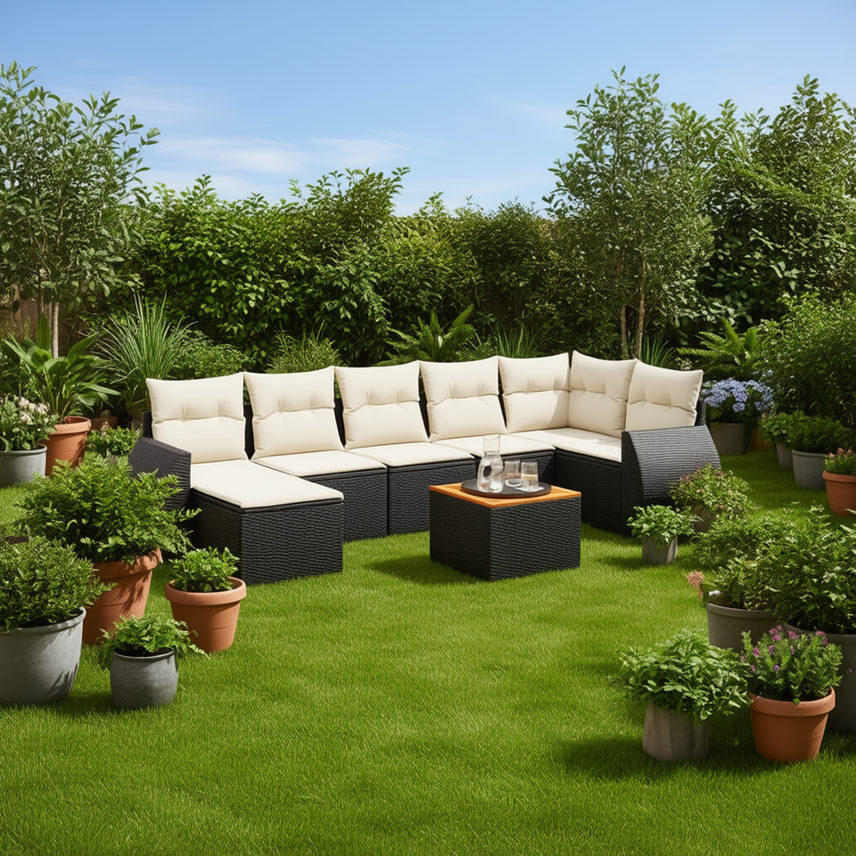 Black Garden Sofa Set Rattan Outdoor Furniture With High-Density Foam Cushions Waterproof Contemporary Design