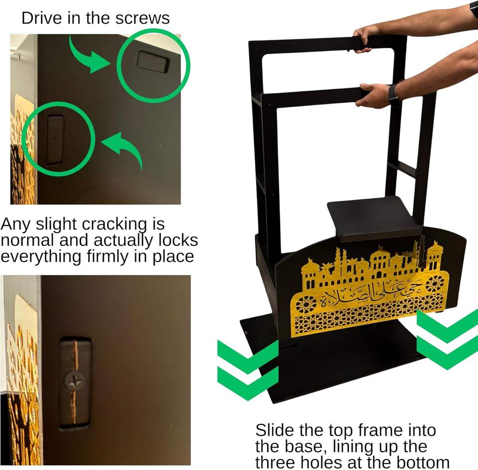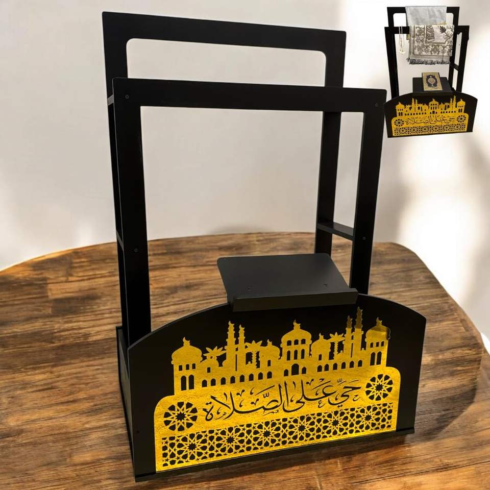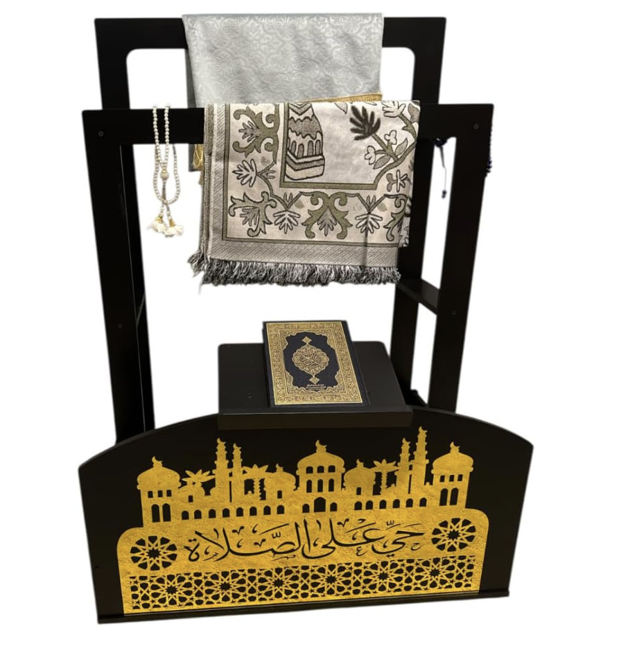 Corano in legno nero e oro e supporto per tappeti da preghiera con calligrafia araba