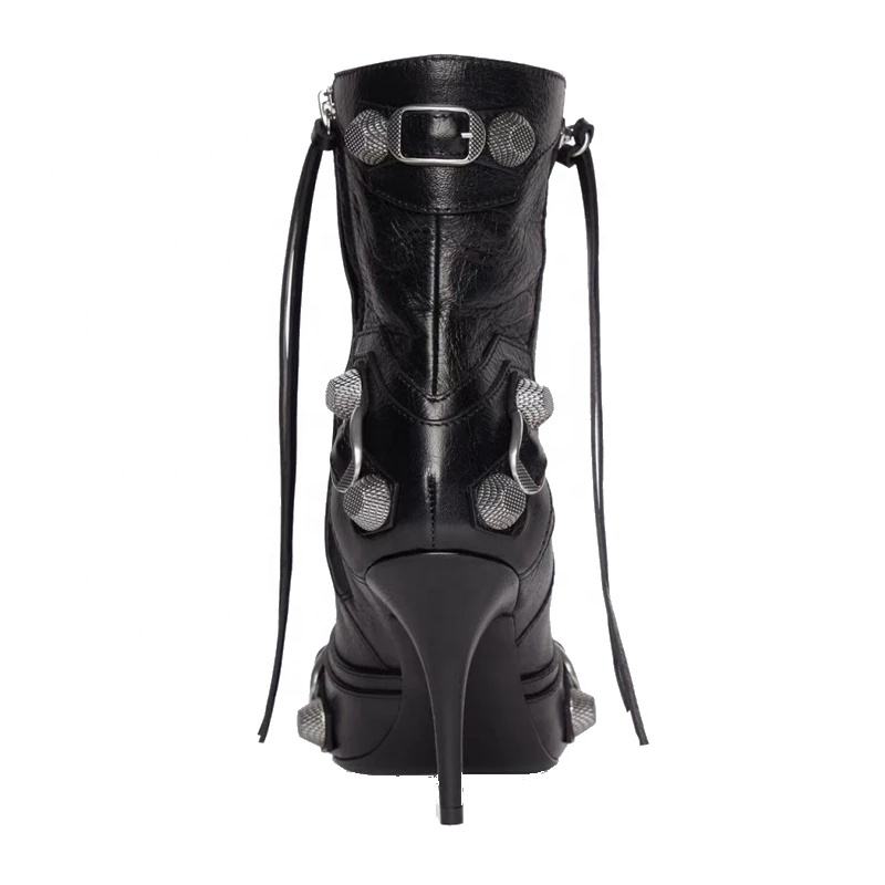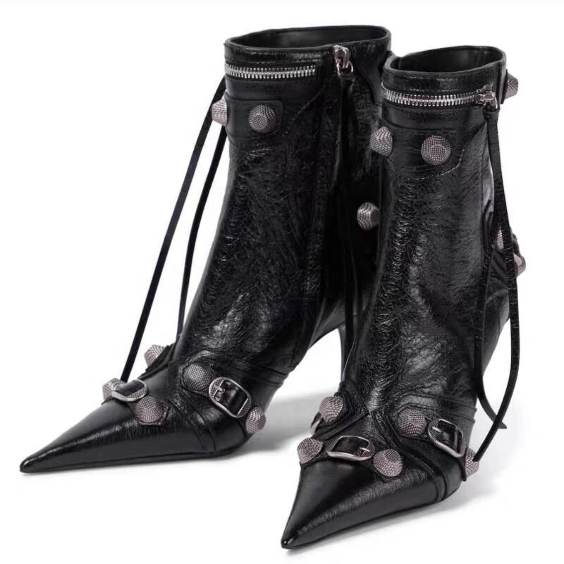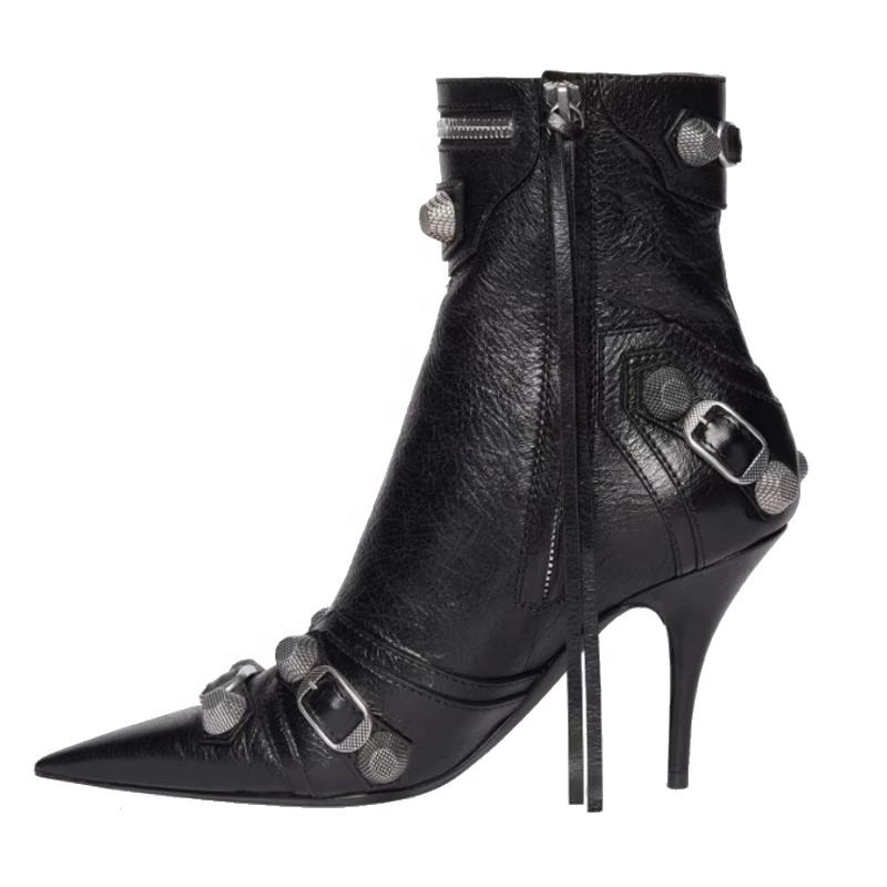 Scarpe bottino in pelle con tacco alto nero scarpe a punta stivaletti da donna Sexy con fibbia a Zip borchie corte moda donna taglia grande 43