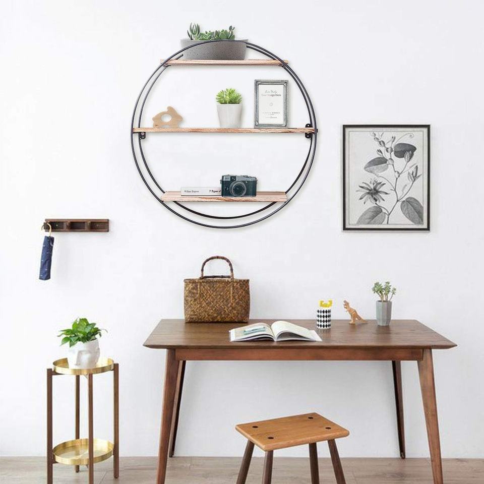 Mensola Decorativa da Parete in Ferro Nero, Forma Rotonda a Tre Ripiani con Scaffale in MDF