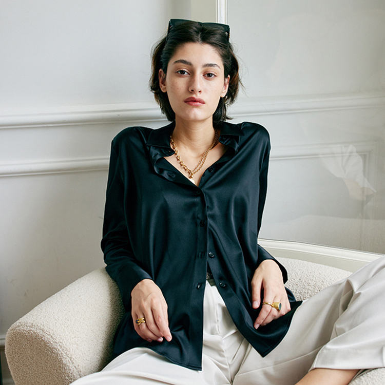 Black Loose Custom logo Women 100% Pure Mulberry Silk Shirts Blouses Top with Long Sleeves