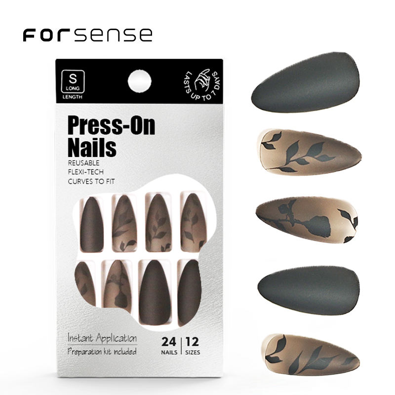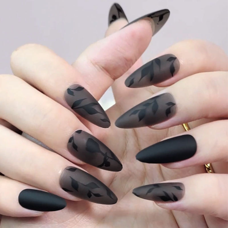 Black Matte a mandorla corta sulla punta per unghie fornitore indossabile unghie da donna con disegni foglia Trending unghie finte Kit Box