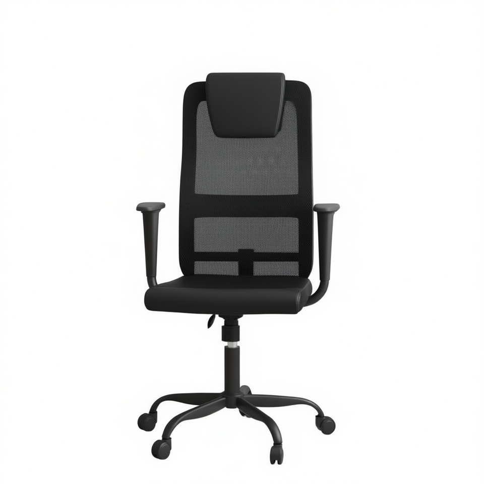 Sedia da ufficio in rete nera con poggiatesta integrato e braccioli fissi per uso commerciale