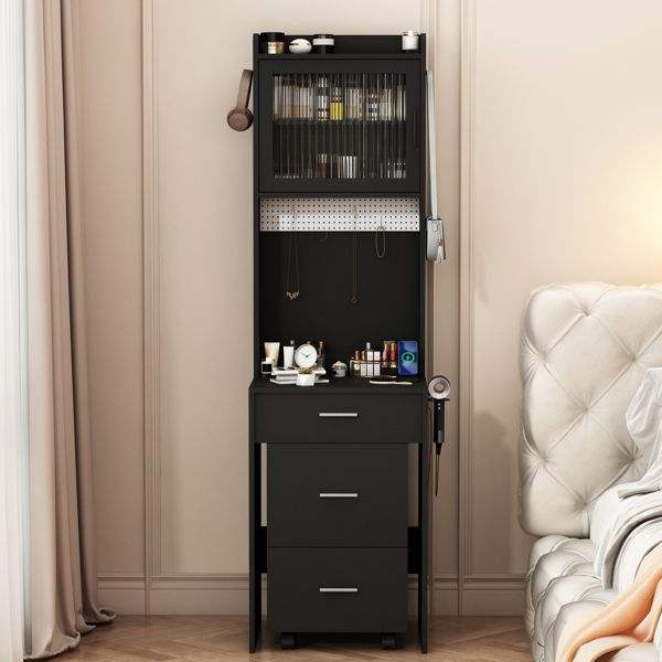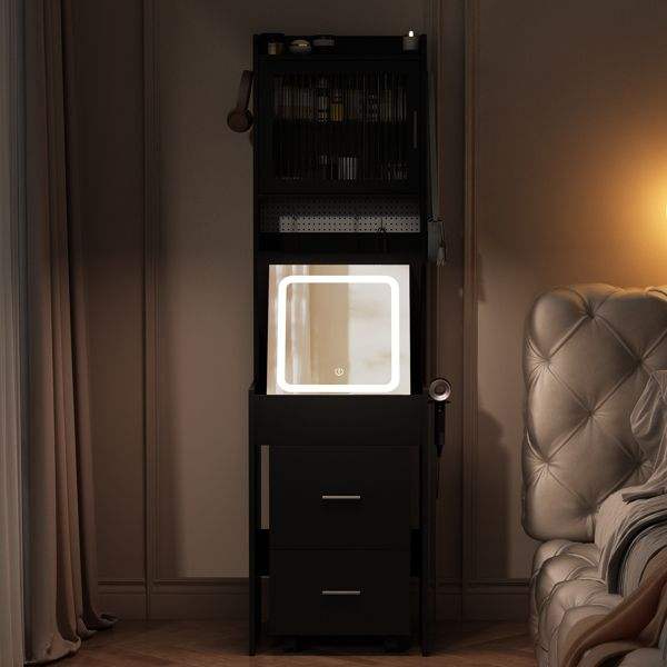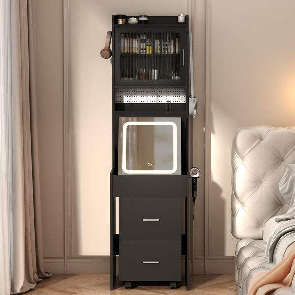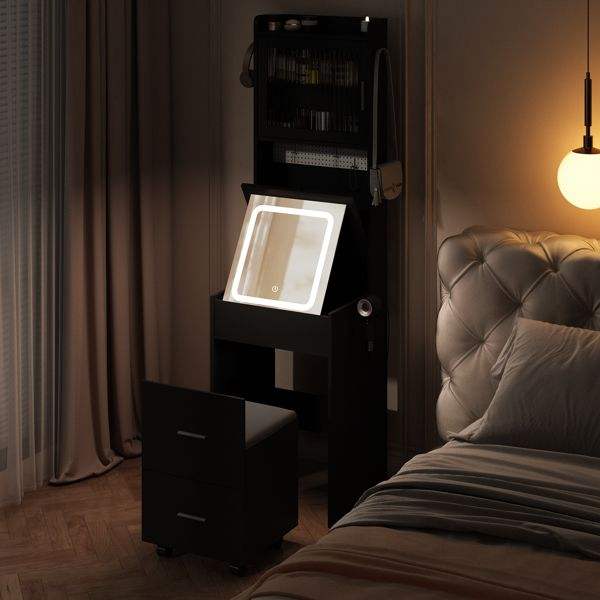 Black Mini Corner Vanity Set with LED Lights Charging Station & Storage Shelves for Small Spaces Makeup Vanities for Bedroom