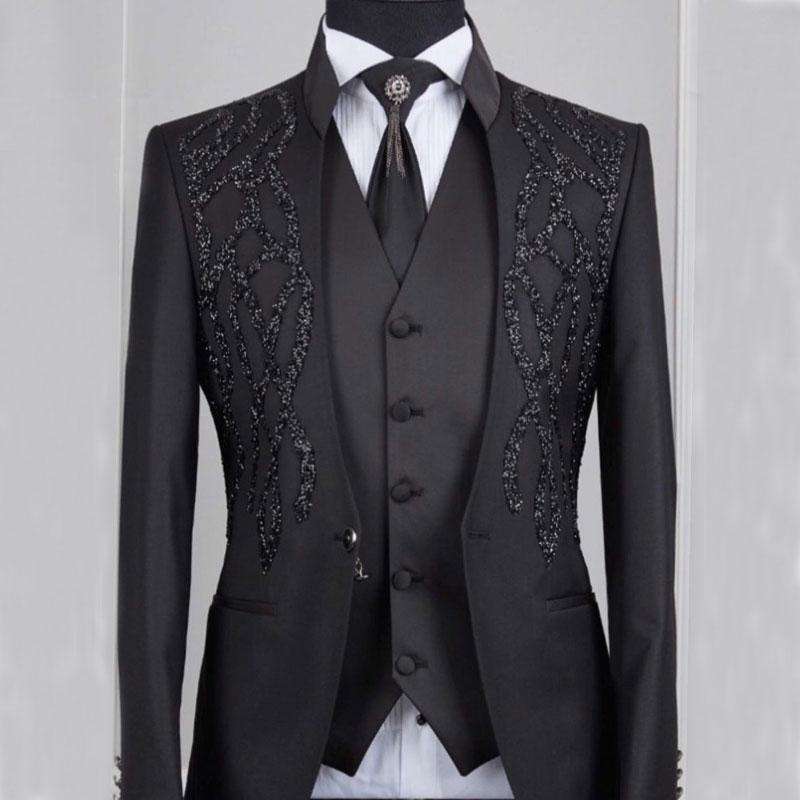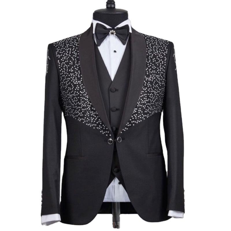 Black One Button Beading Men Tuxedos Groom Wedding Suits Shawl Lapel Blazer Three Pieces Groomsman Clothing Jacket Vest and Pant