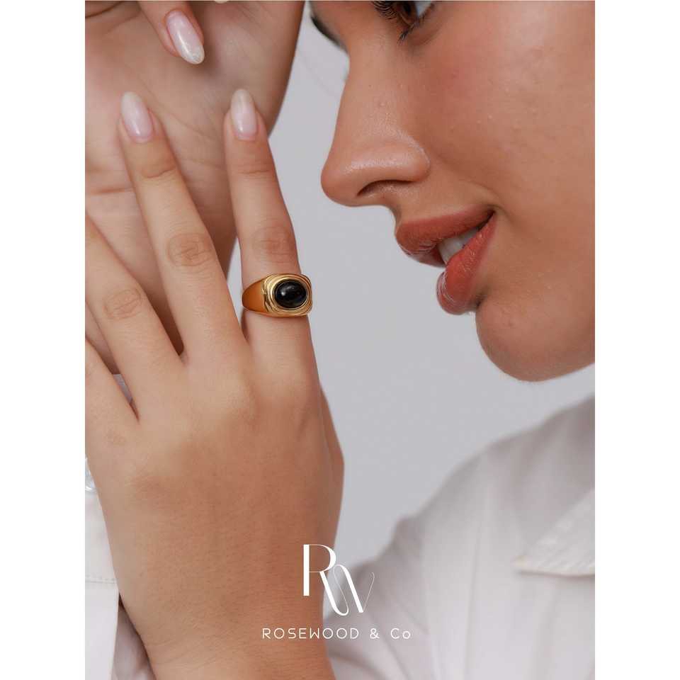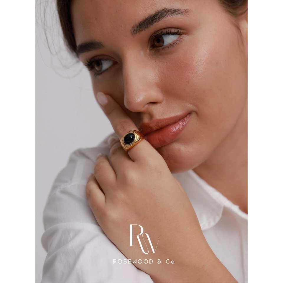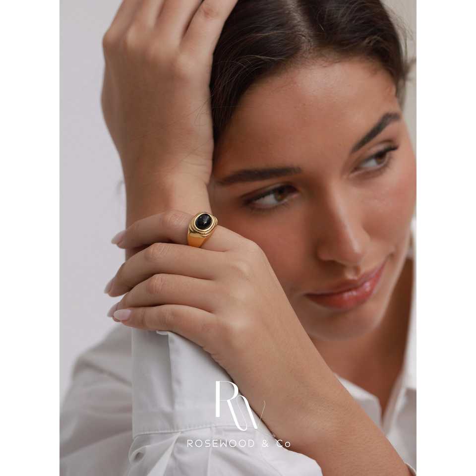 Anello con gemma quadrata in onice nero, anello a fascia con sigillo a raggi di sole in oro anti-ossidazione, impermeabile, con tecnica di incastonatura a griffe, anello massiccio con agata naturale