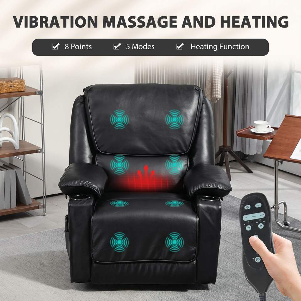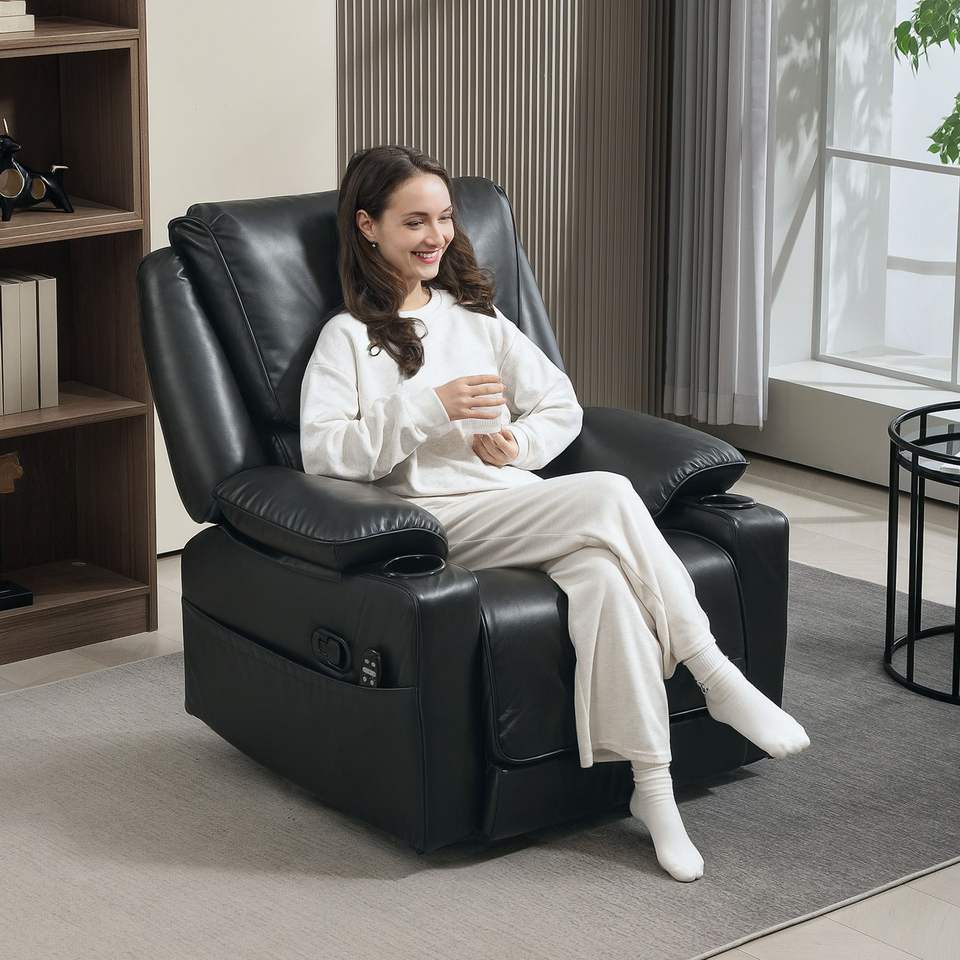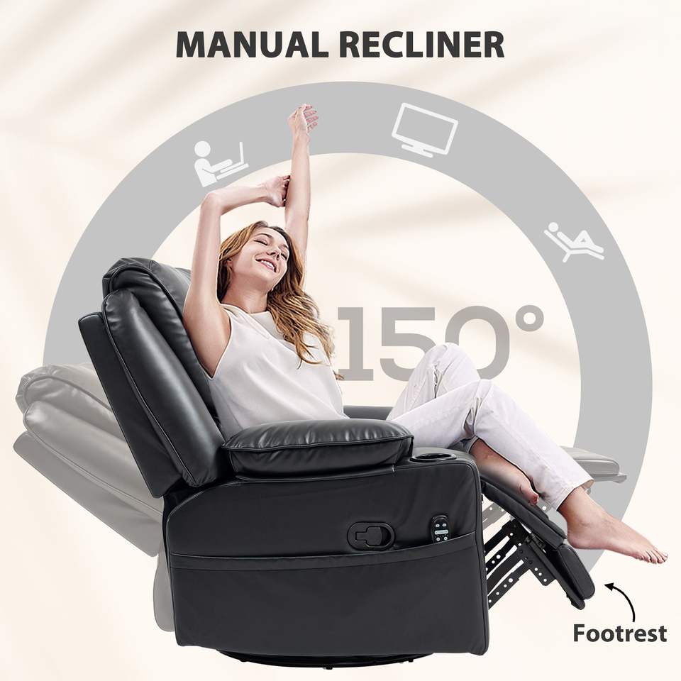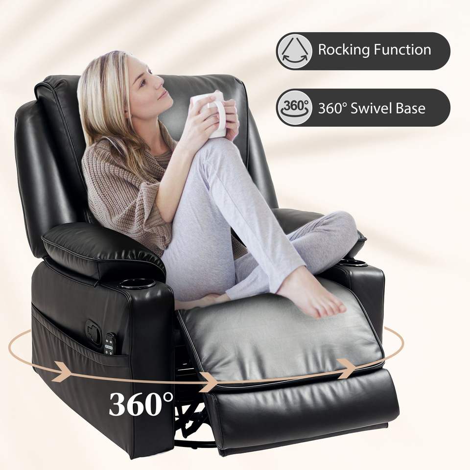 Poltrona Reclinabile Girevole Oversize Nera con Massaggio e Riscaldamento, Poggiapiedi, Telecomando e Tasche Laterali