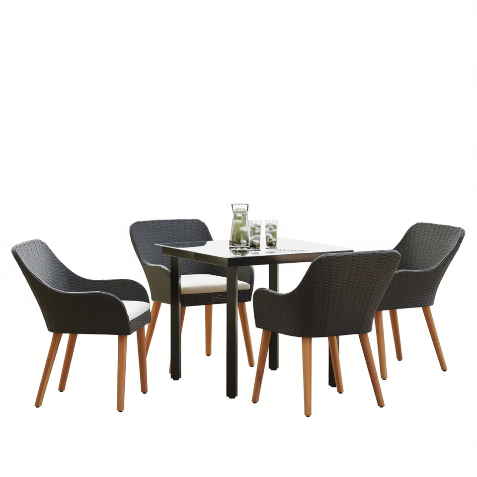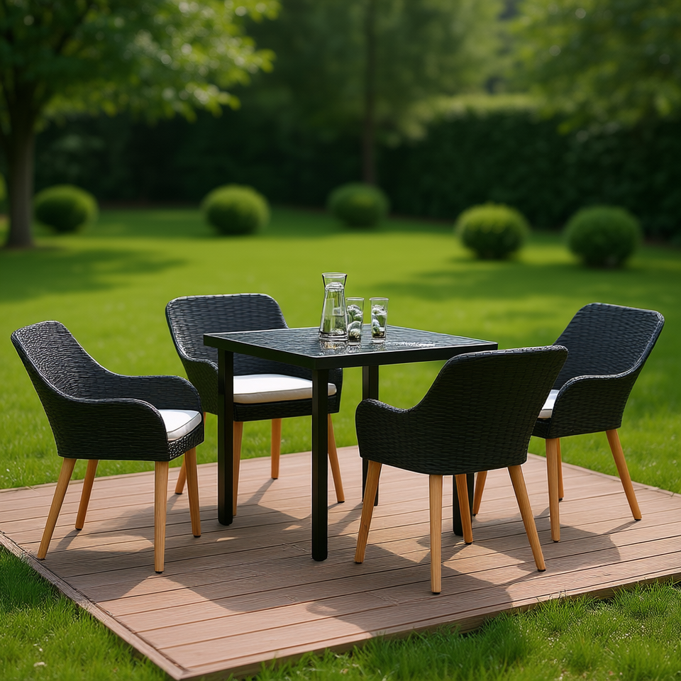 Set da Pranzo da Giardino in Polyrattan Nero per 4 Persone con Cuscini, Arredamento Esterno Contemporaneo