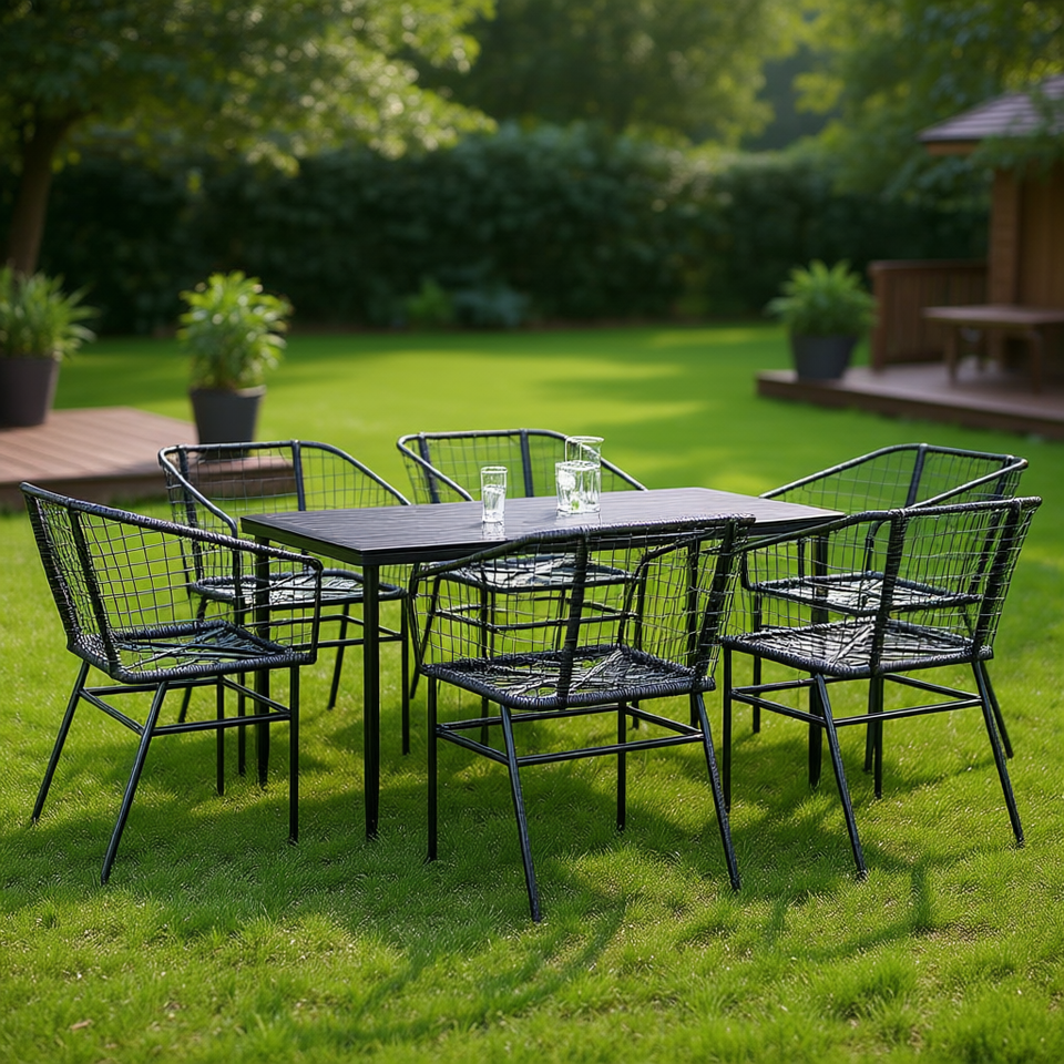 Set da Pranzo da Esterno in Polyrattan Nero, 7 Pezzi, con Struttura in Metallo, Stile Elegante, con Piano in Vetro