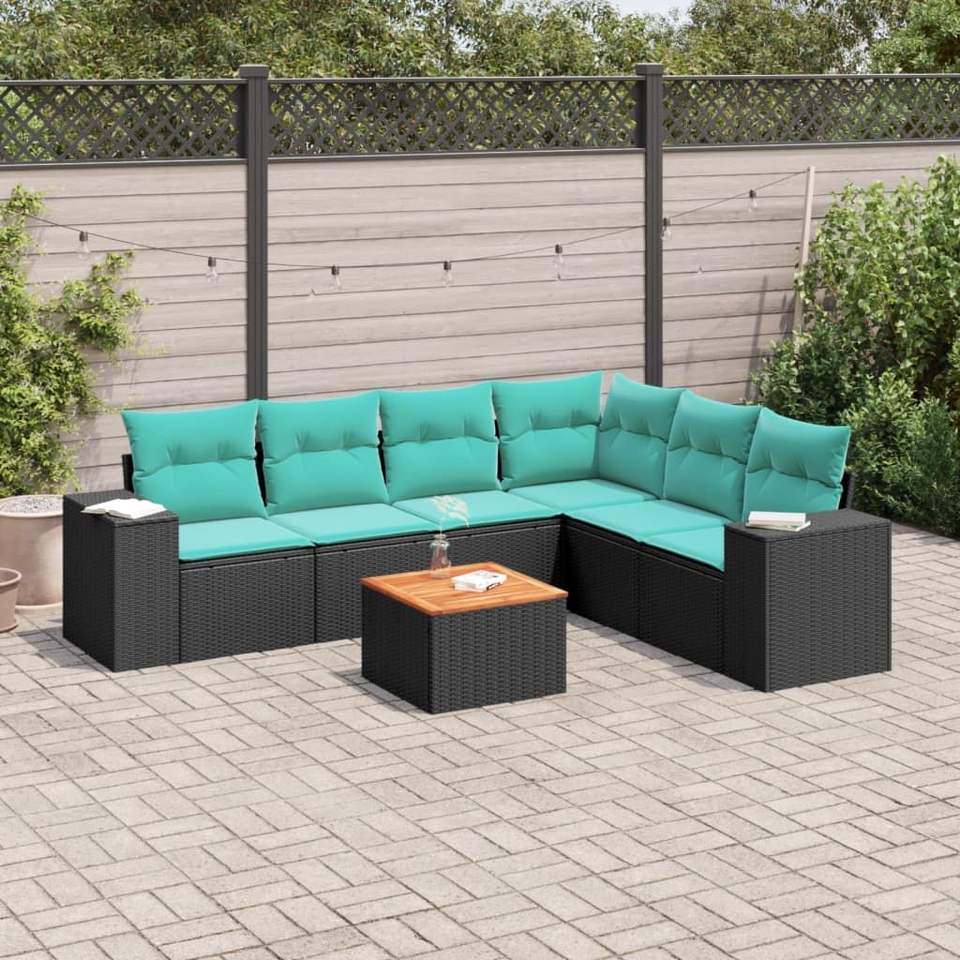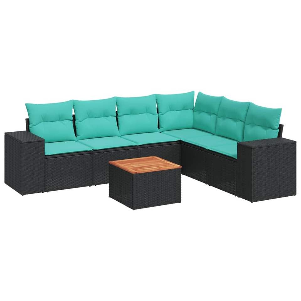 Set Divano da Esterno in Polyrattan Nero con Cuscini, Arredamento da Giardino Stile Contemporaneo, 7 Pezzi