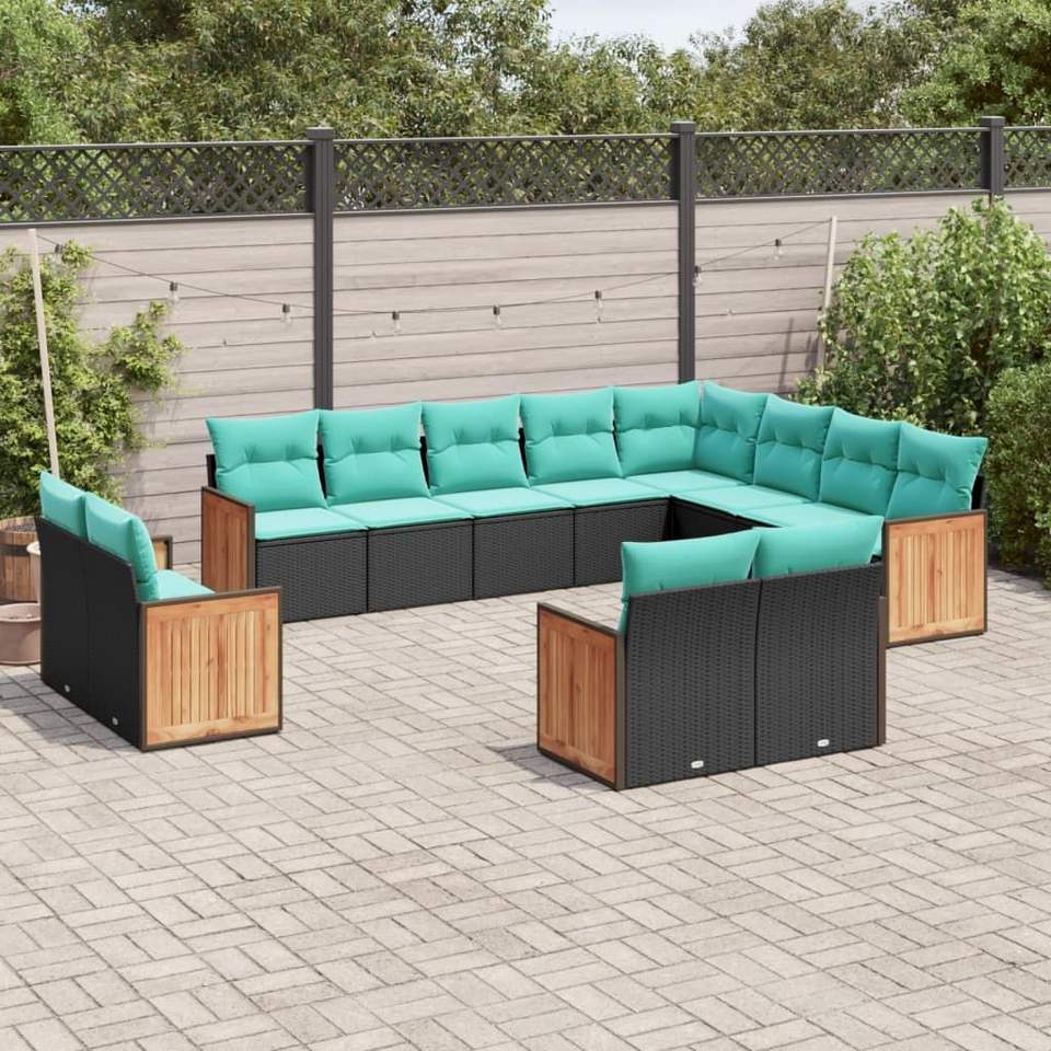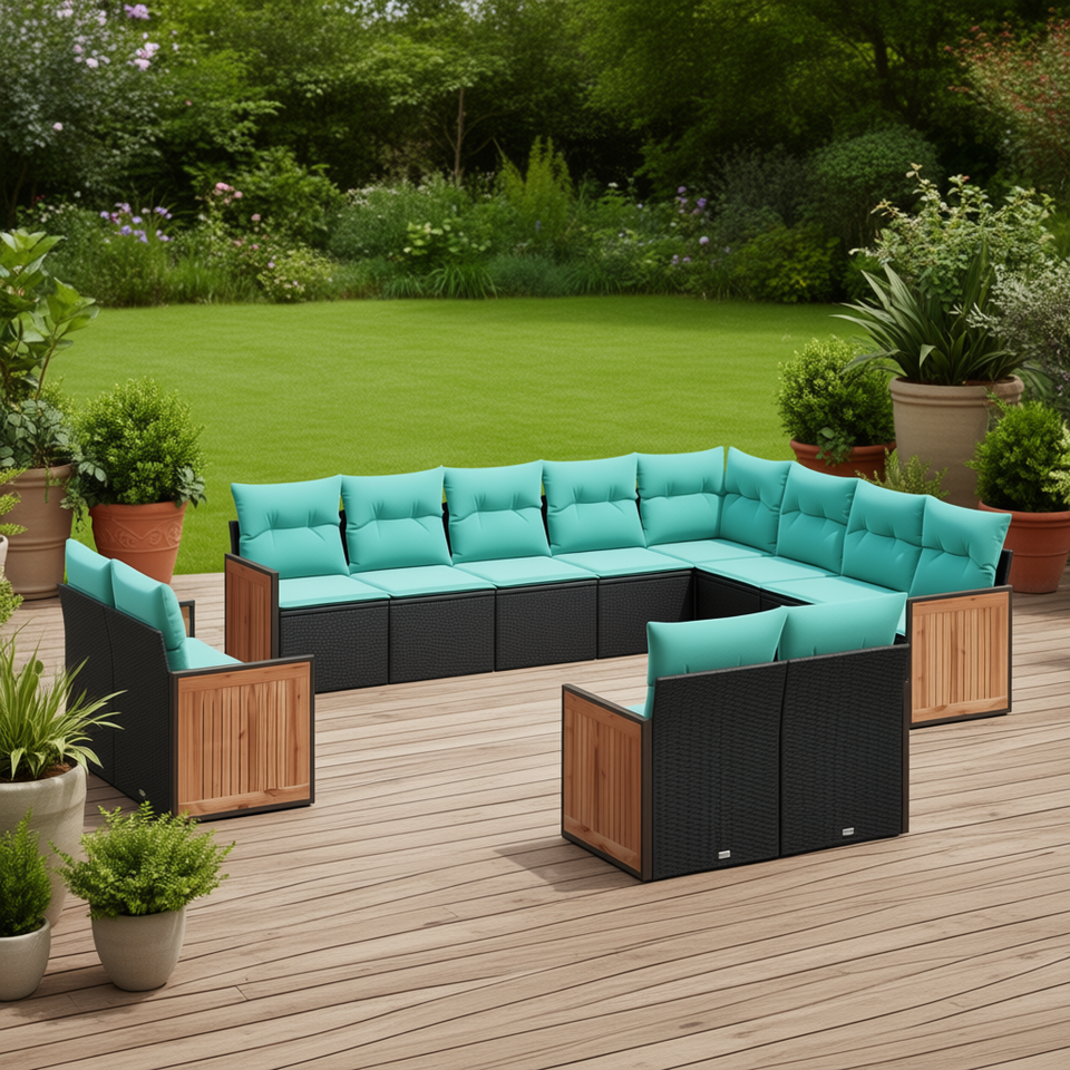 Set di divani da giardino in polyrattan nero con cuscini per arredamento da esterno dal design contemporaneo