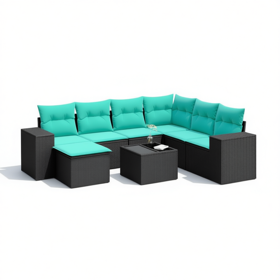 Set di divani da giardino in polyrattan nero, 8 pezzi con cuscini, mobili da esterno dal design moderno e contemporaneo