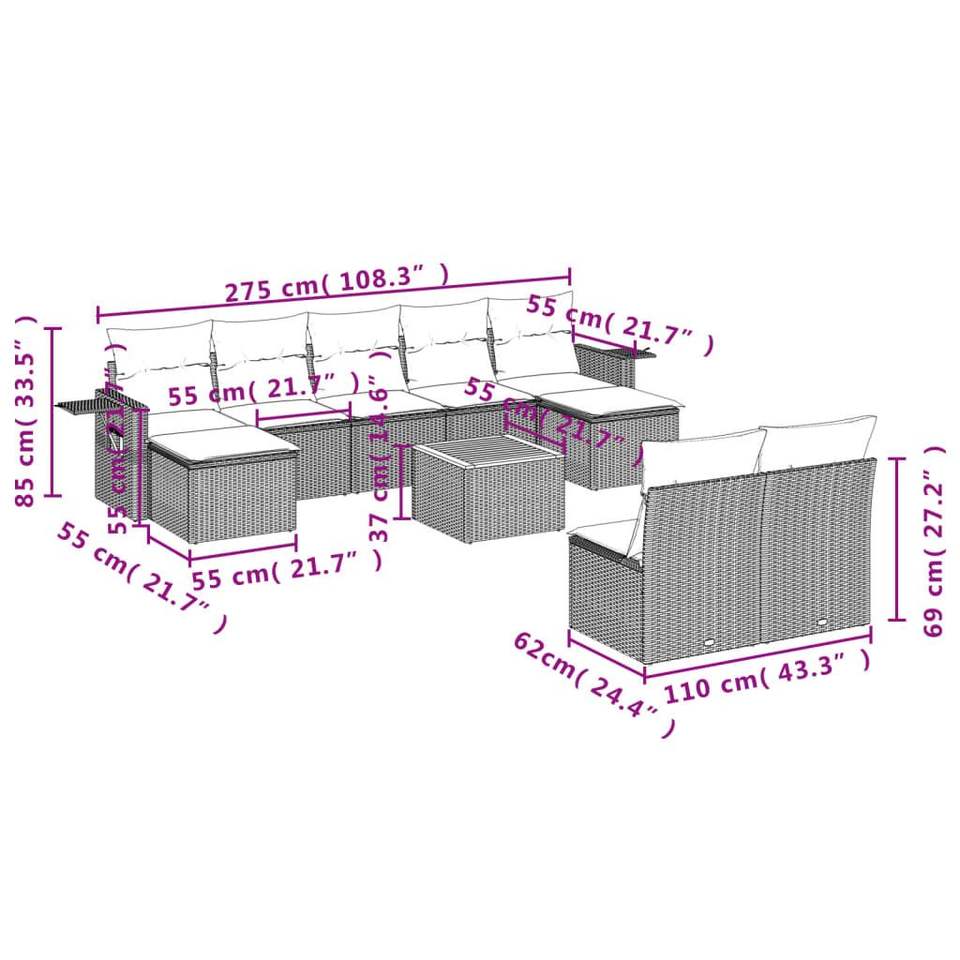Set di divani da giardino in polyrattan nero da 10 pezzi con cuscini, mobili da esterno, design contemporaneo, stile moderno