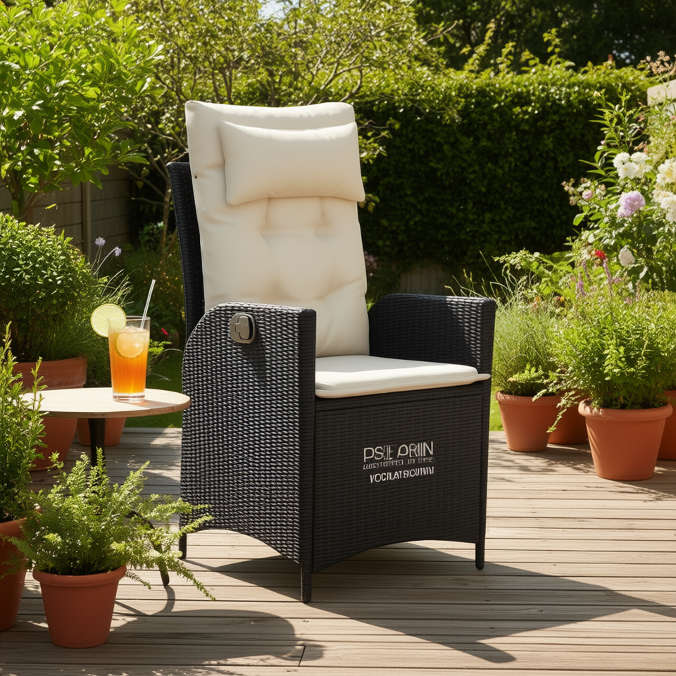 Sedia reclinabile da patio in polyrattan con cuscini, set di mobili da esterno dal design moderno, nero e crema