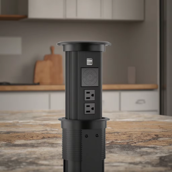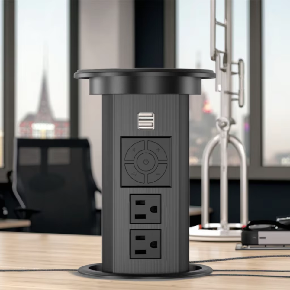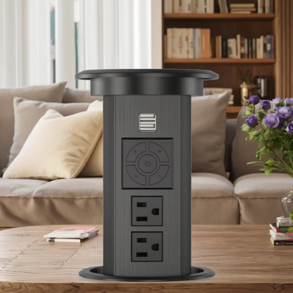 Black Power Waterproof Motorized Smart Kitchen Pop up Tabletop Tower Socket With 15w Wireless Charger Desk Sockets