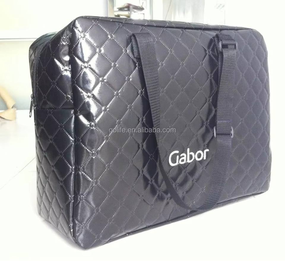 Black Quilted Embossed Non-Woven Tote Bag with Zipper Closure for Travel Storage