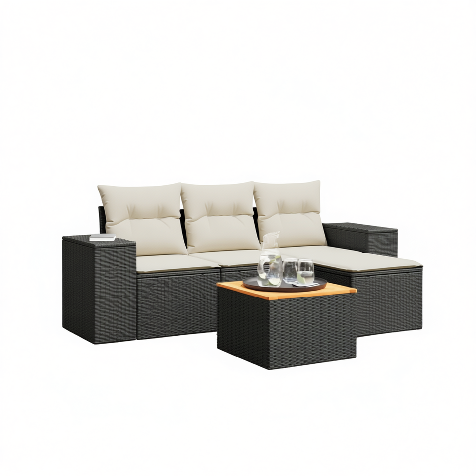 Set Divano da Giardino in Rattan Nero con Cuscini Crema, Arredamento da Esterno Impermeabile dal Design Contemporaneo