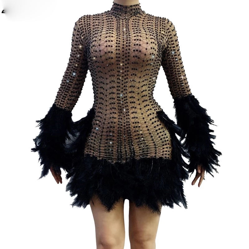 Abito Nero con Strass e Piume, Vestito Trasparente per Compleanno, Outfit in Rete per Feste, Abiti da Ballo per Ballerine e Cantanti