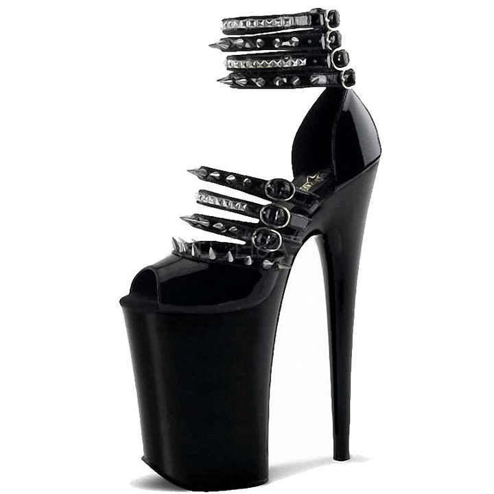 FLY CENTURY Sandali con tacco sottile 20 cm (8") in PU, borchie nere stile punk, peep-toe, soletta in pelle di maiale per stripper