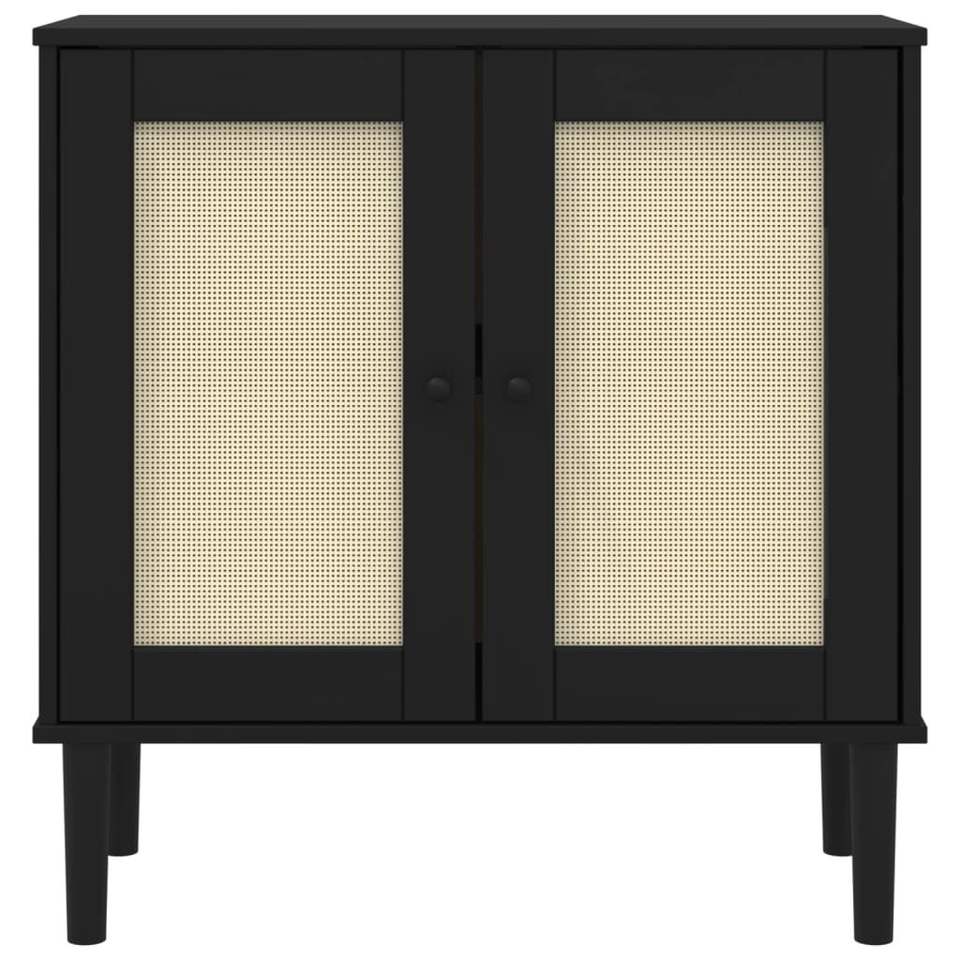 Black Solid Pine Wood and Engineered Wood Sideboard with Poly Rattan Furniture Piece