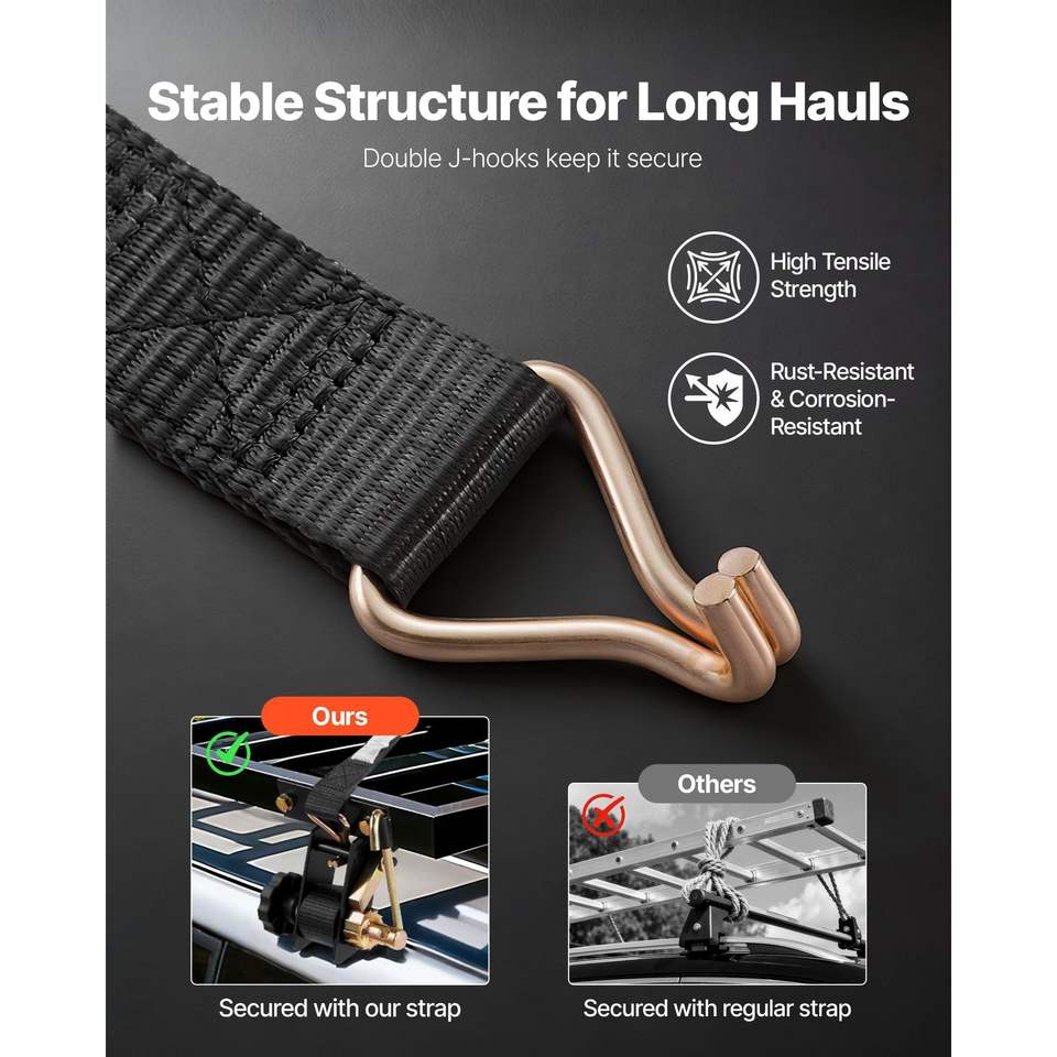 Cinghie a cricchetto nere per portascatole da montare su tubo quadro, larghe 1,5 pollici x lunghe 7,4 piedi, con doppi ganci a J da 50 pollici